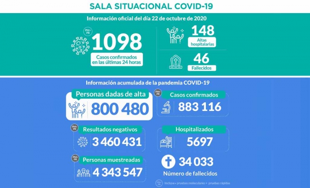 Durante el 22 de octubre se registraron los resultados de 26 668 personas muestreadas, de los cuales 1 098 fueron casos sintomáticos confirmados de ese día.