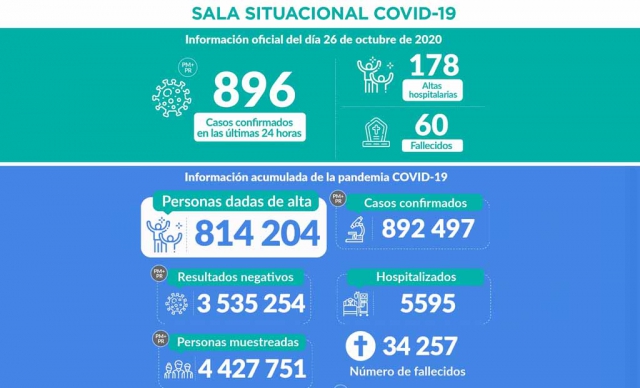 Durante el 26 de octubre se registraron los resultados de 20 458 personas muestreadas, de los cuales 896 fueron casos sintomáticos confirmados de ese día.