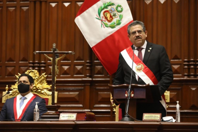 Merino de Lama recibió la banda presidencial de manos del primer vicepresidente del Parlamento, Luis Valdez. Esta decisión lo logró, tras pretender destituir al expresidente Martín Vizcarra en el mes de septiembre y que no se quedaron satisfechos, situación que lo logró en la segunda oportunidad. La población peruana, no acepta esta medida y cuestiona la actitud arbitraria como se vacó al predecesor.