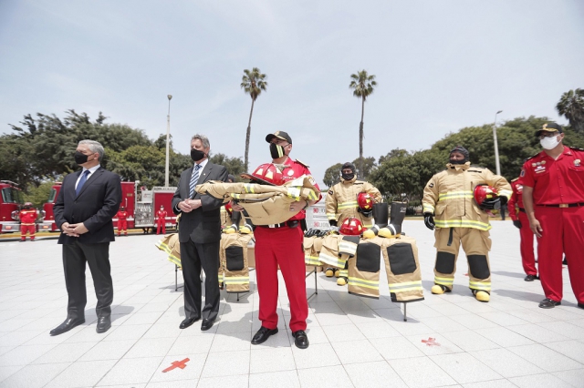Pero también -precisó-, dota a los bomberos de las 64 compañías de las cuatro comandancias departamentales de Lima Metropolitana con equipos del más alto estándar internacional de protección contra incendios y con las características técnicas y de confección de los trajes de bomberos profesionales.