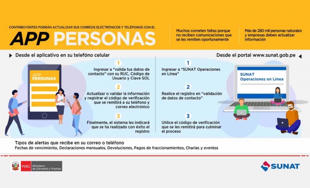 ERP. Desde al APP Personas de la SUNAT, los contribuyentes, especialmente quienes tienen pequeños negocios o brindan servicios profesionales, pueden ahora actualizar sus datos de teléfono y correo electrónico para recibir de manera oportuna recordatorios y alertas que les permitirán estar siempre al día y evitar incumplimientos involuntarios.