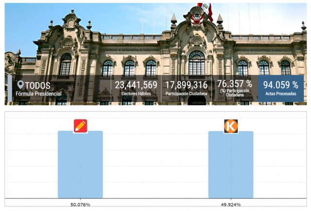 Hasta el momento según el organismo electoral se han procesado el 94.059 % de las actas, de las cuales se han contabilizado 92.620 %. A dicho porcentaje el maestro de escuela tiene el 50.076% de los votos válidos emitidos, contra el 49.924% de su contendora.