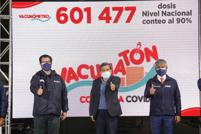 ERP. El Ministro de Salud (Minsa) Hernando Cevallos Flores informó que en el séptimo vacunatón realizado este fin de semana en Lima, Callao y 15 regiones del país, en total se aplicaron 601 477 vacunas contra la covid-19, con lo cual se superó la meta de las 600 mil dosis. Asimismo, anunció que desde este lunes se estará dando inicio a la inmunización de personas mayores de 30 años de edad.