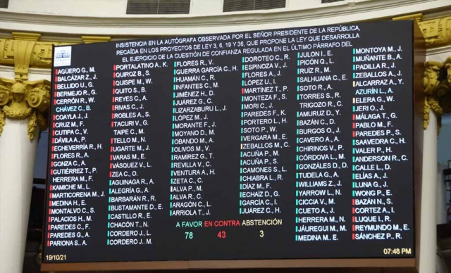 ERP. El pleno del Congreso aprobó hoy por insistencia la autógrafa de ley, observada por el Ejecutivo, que interpreta la cuestión de confianza regulada en los artículos 132 y 133 de la Constitución. La representación nacional apoyó esta aprobación por 79 votos a favor, 43 en contra y tres abstenciones. Posteriormente, el congresista de Perú Libre, Edgar Tello, pidió la reconsideración de la votación, aunque esta fue rechazada por 80 votos en contra, 40 a favor y tres abstenciones.