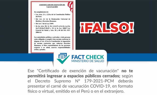 En sus redes sociales, el Minsa pidió a la ciudadanía evitar compartir esta noticia falsa y recalcó que ese "Certificado de exención de vacunación" no permitirá ingresar a espacios públicos cerrados.
