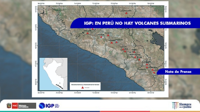 Al respecto, el Instituto Geofísico del Perú (IGP), organismo adscrito al Ministerio del Ambiente, precisa que la totalidad de volcanes activos y potencialmente activos existentes en nuestro país se emplazan en la zona sur de los Andes del Perú, cuyos procesos eruptivos se caracterizan por la expulsión de columnas de cenizas y gases, flujos piroclásticos, lahares, flujos de lava, avalanchas de escombros, etc., que difícilmente alcanzarían la línea de costa.
