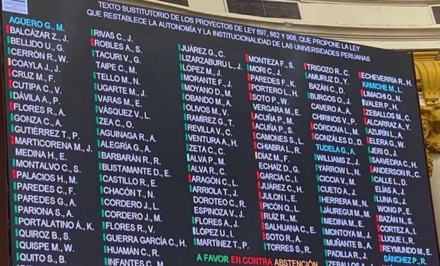 ERP. El pleno del Congreso aprobó hoy, en primera votación, la ley que propone restablecer la autonomía y la institucionalidad de las universidades peruanas, ello a través de la modificación del consejo directivo de la Superintendencia Nacional de Educación Superior Universitaria (Sunedu).