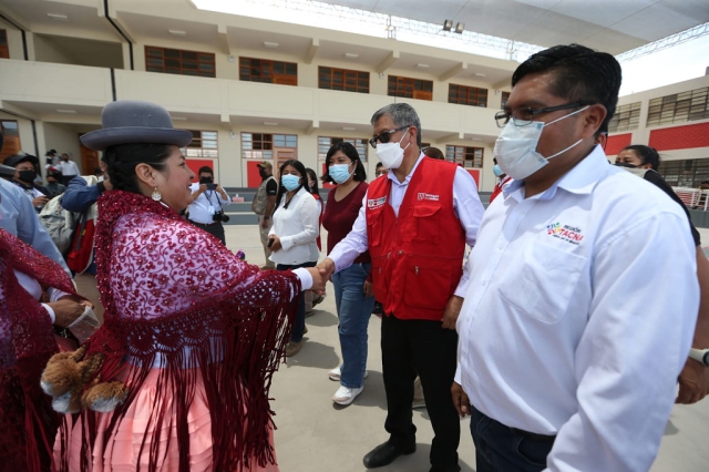 Por la mañana, el ministro Serna visitó las instituciones educativas Luis Alberto Sánchez y Guillermo Auza Arce y luego participó en la inauguración de las obras de mejoramiento y ampliación del colegio Manuel A. Odría, ubicado en el distrito de Ciudad Nueva, en la provincia de Tacna.