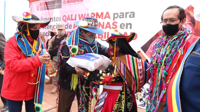 Acompañado por la ministra de Desarrollo e Inclusión Social, Dina Boluarte, el mandatario entregó esta mañana más de 14 toneladas de alimentos del Programa Qali Warma a la Municipalidad de Huata. En esa línea, sostuvo que en la actual coyuntura es necesario llegar con alimentos a las instituciones educativas y a las poblaciones vulnerables.
