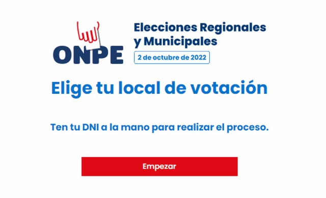 ERP. La Oficina Nacional de Procesos Electorales (ONPE) habilitó este domingo 15 de mayo la plataforma 'Elige tu local de votación' para que los más de 24 millones de ciudadanos y ciudadanas que podrán sufragar en las elecciones regionales y municipales del 2 de octubre seleccionen hasta tres posibles locales de votación. La selección –de carácter obligatorio– facilitará la asignación de locales de votación cercanos a los domicilios de los votantes.