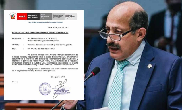 "Hacer de su conocimiento sobre la ubicación y captura de la persona de Héctor Valer Pinto (63), congresista de la República, efectuado en la fecha en la ciudad de Lima, quien registra requisitoriado por el delito contra los recursos naturales y el medio ambiente-contaminación ambiental", indica el documento.