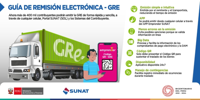 ERP. La Superintendencia Nacional de Aduanas y de Administración Tributaria (SUNAT) ha publicado en su portal institucional un proyecto de resolución que amplía los canales para agilizar y optimizar la emisión de la Guía de Remisión Electrónica (GRE) Transportista y Remitente, lo cual facilitará el cumplimiento de obligaciones tributarias a más de 400,000 contribuyentes.