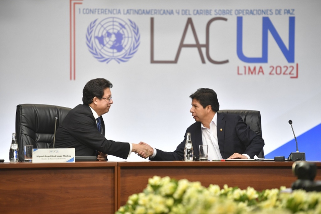 El evento contó también con la presencia del ministro de Defensa, Richard Tineo Quispe; el ministro de Relaciones Exteriores, Miguel Rodríguez Mackay; y el Subsecretario General Adjunto de las Naciones Unidas, Birame Diop.