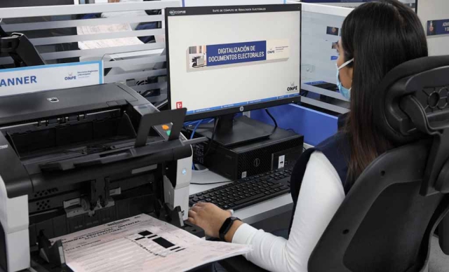 Como parte de este proceso, las actas elaboradas por los miembros de mesa son enviadas a los centros de cómputo de las ODPE, donde son digitalizadas para luego pasar un primer control de calidad destinado a comprobar el cumplimiento de exigencias formales como la claridad de la imagen. Seguidamente, son sometidas a una doble digitación; es decir, dos personas por separado digitan las cifras y estas solo son ingresadas al sistema si ambas digitaciones coinciden.