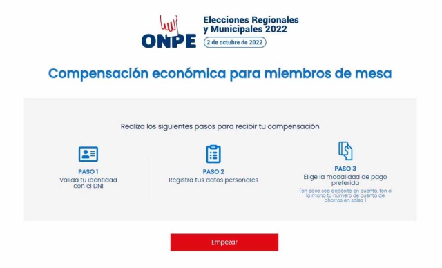 ERP. La Oficina Nacional de Procesos Electoral (ONPE) informa que desde hoy miércoles 5 de octubre abrió el registro en la página web, para que los ciudadanos de la cola que ejercieron el cargo de miembro de mesa de mesa, por ausencia de los miembros de mesa sorteados, registren sus datos y puedan cobrar la compensación económica de S/ 120.00.