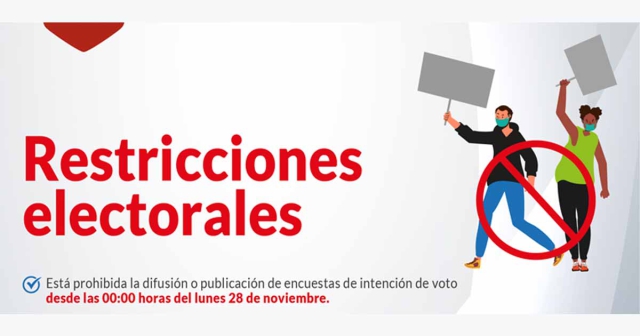 Asimismo, desde las 00:00 horas del viernes 2 de diciembre estará prohibida la realización de reuniones o manifestaciones de carácter político. Su vulneración, conforme al artículo 190 y 388 de la LOE, se sanciona con cárcel no menor de 3 meses ni mayor de 2 años.