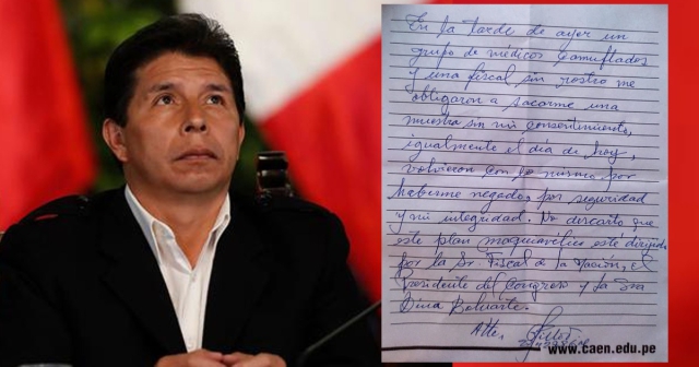 ERP. Aún la población peruana analiza y discute respecto a lo sucedido por el expresidente Pedro Castillo Terrones quien se encuentra con detención preliminar. Adicionalmente a lo conocido, el congresista Guillermo Bermejo difundió una carta de puño y letra del exmandatario, quien precisa que médicos camuflados pretendieron extraerle una muestra de sangre a lo que él se negó.