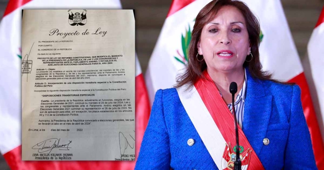 ERP. La presidenta de la República Dina Boluarte oficializó el anuncio que hizo en mensaje a la Nación y presentó ante el Congreso de la República el proyecto de reforma constitucional para establecer el adelanto de elecciones en abril de 2024.
