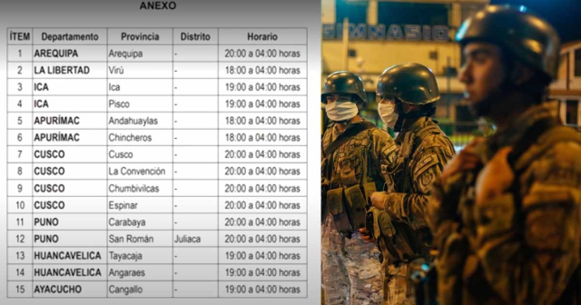 También en las provincias de Cusco, La Convención, Chumbivilcas Espinar, en el Cusco, de 20:00 a 04:00 horas; en Carabaya y San Román (Juliaca), en Puno, de 20:00 a 04:00 horas; en Tayacaja y Angaraes, en Huancavelica, de 19:00 a 04:00 horas; en Cangallo (Ayacucho) de 19:00 a 04:00 horas.