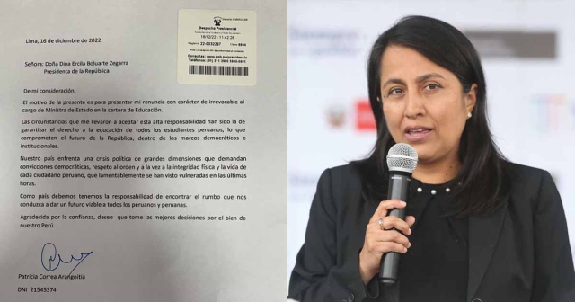 ERP. La ministra de Educación, Patricia Correa, presentó su renuncia al cargo ante la presidenta Dina Boluarte, a raíz de los decesos registrados en los enfrentamientos entre las fuerzas del orden y manifestantes durante las protestas en el interior del país.