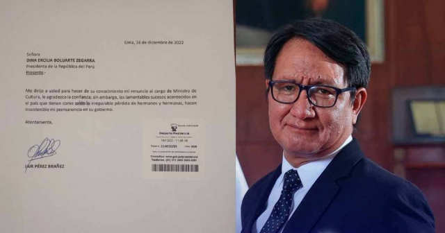 "Los lamentables sucesos acontecidos en el país tienen como saldo la irreparable pérdida de hermanos y hermanas hacen insostenible mi permanencia en su gobierno", se puede leer en el documento dirigido a la presidenta Dina Boluarte.