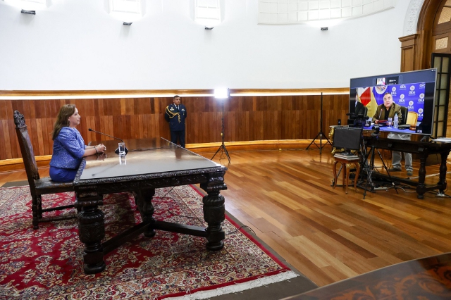 “Elecciones libres, democráticas y con todas las garantías, con la observación de la OEA, de la comunidad internacional, y de los amigos del Perú. Ese es el derrotero de salida a la crisis”, manifestó la jefa de Estado en el discurso que ofreció de manera virtual.