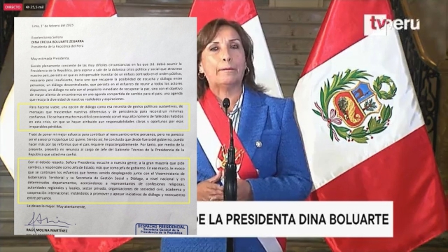 ERP. En tanto que la mayoría de ministros se aferran a sus cargos y soslayan la crisis política que vive el Perú, Raúl Molina Martínez renunció como jefe de Gabinete Técnico de la Presidencia de la República. Demanda escuchar a las voces que piden cambios y dar "gestos políticos sustantivos" después de exponer sus argumentos, presenta su alejamiento de este equipo de gobierno.