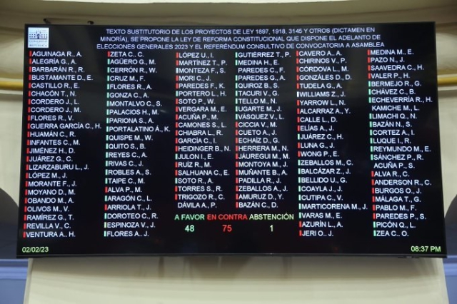 ERP. El Pleno del Congreso de la República desoyendo el clamor de la calle y con la poco disimulada intención de quedarse hasta el 2026 decidió una vez más rechazar el proyecto de adelanto de elecciones generales. Tras discutirse el dictamen de minoría suscrito por el Congresista Jaime Quito y sometido a votación se logró solo 48 votos a favor, 75 en contra y una abstención.