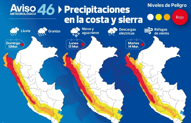 En efecto, el SENAMHI informa que entre el domingo 12 y martes 14 de marzo se presentarán precipitaciones (nieve, granizo, aguanieve y lluvia) de moderada a extrema intensidad en la costa y sierra. Estas precipitaciones estarán acompañadas de descargas eléctricas y ráfagas de viento con velocidades cercanas a los 35 km/h. Además, se espera la ocurrencia de granizo de forma localizada en zonas por encima de los 2800 m. s. n. m. y nieve aislada en localidades sobre los 4000 m. s. n. m.