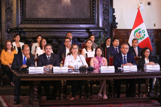 En la conferencia, la presidenta Boluarte estuvo acompañada por el jefe del Gabinete Ministerial, Alberto Otárola, quien participó de manera virtual, y los ministros de Estado.
