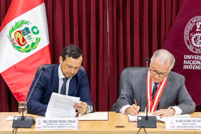 La firma del convenio tuvo lugar en una ceremonia oficial, y estuvo a cargo del presidente del Consejo Directivo del Ceplan, Giofianni Peirano Torriani, y el rector de la Universidad Nacional de Ingeniería (UNI), Alfonso López Chau. Ambas autoridades destacaron la importancia de esta alianza y manifestaron su disposición para articular esfuerzos y contribuir al logro de las metas establecidas en el convenio.