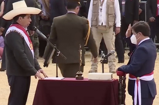 ERP. El presidente de la República Pedro Castillo Terrones, procedió a la juramentación de su primera gabinete el cual será presidido por el congresista Guido Bellido Ugarte, quien juramentó de manera simbólica en Pampa de la Quinua en Ayacucho. El acto oficial se cumplió en el Gran Teatro Nacional, en el distrito de San Borja, dejando su tradicional escenario en Palacio de Gobierno, el cual será convertido en museo.