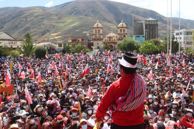 ERP. El candidato presidencial Pedro Castillo Terrones, se dirigió a la población de Pampas de Huancavelica reunida en la Plaza de Armas, para difundir sus propuestas que se centran en utilizar los recursos naturales a favor del pueblo peruano, lucha frontal contra la corrupción, educación de calidad y sobre todo, el cambio de la Constitución Política del Perú, la cual fue aprobada en la dictadura del padre de su contendora.