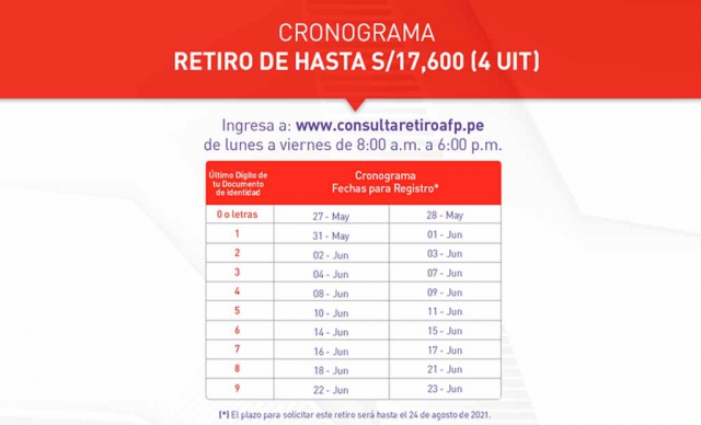 ERP. Hoy la Superintendencia de Banca, Seguros y AFP (SBS) anunció que los afiliados de las AFP podrán realizar el retiro de hasta S/ 17,600 de los fondos a partir del 27 de mayo. Ante esto, las administradoras de fondos han establecido fechas exactas para que los afiliados puedan realizar el desembolso acorde a su número de DNI.