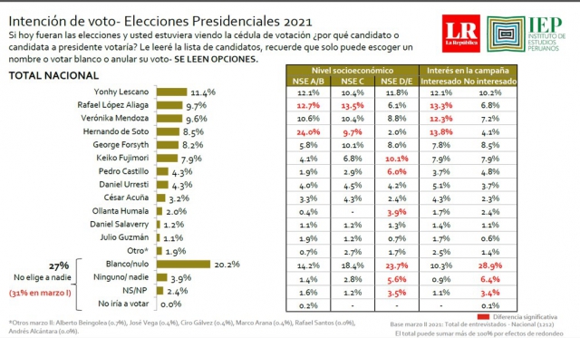 ERP. La situación de la pandemia ha creado un panorama diferente en estas elecciones generales y los resultados posicionan a candidatos como Yonhy Lescano Ancieta de Acción Popular y Verónika Mendoza de Juntos por el Perú. Empatado en el segundo lugar se ubica Rafael López Aliaga, un oscuro personaje que indica ser nuevo en política, pero su organización está copada de apristas.