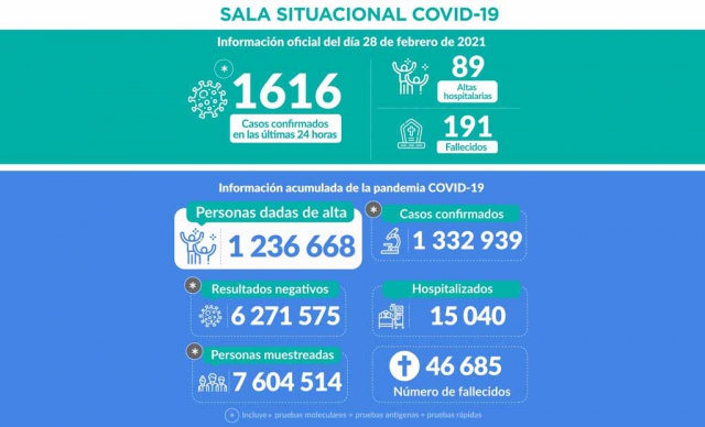 ERP. El Ministerio de Salud (Minsa) informó que a la fecha a nivel nacional se registra 46 685 fallecidos y 1 332 939 casos acumulados de nuevo coronavirus. Hasta las 22:00 horas del día 28 de febrero de 2021 se han procesado muestras para 7 604 514 personas por la COVID-19, obteniéndose, 1 332 939 casos confirmados y 6 271 575 negativos.