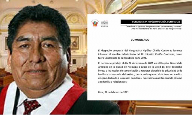 ERP. El congresista Hipólito Chaiña falleció este lunes 22 de febrero en la ciudad de Arequipa luego de contraer el coronavirus (COVID-19). Sandra Rodríguez, asesora del parlamentario de Nueva Constitución, confirmó el deceso de Hipólito Chaiña Contreras, quien ya se encontraba internado desde el pasado martes tras tener síntomas de la enfermedad.
