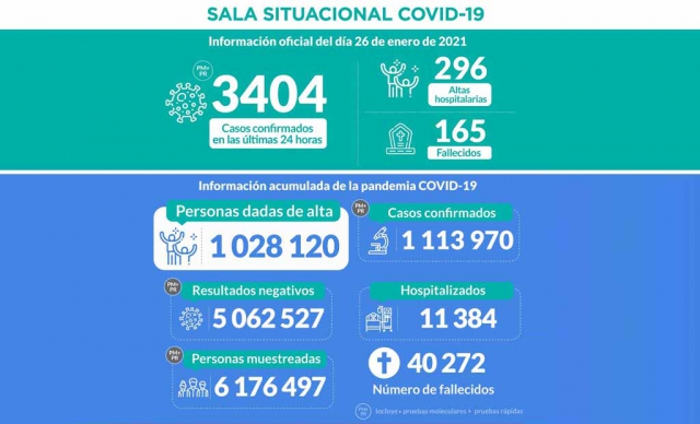 ERP. A 40 272 se elevó el número de fallecidos a causa del coronavirus covid-19 en Perú; mientras que los casos positivos totalizan 1 113 970; informó el Ministerio de Salud (Minsa). Hasta las 22:00 horas del día 26 de enero de 2021 se han procesado muestras para 6 176 497 personas por la COVID-19, obteniéndose, 1 113 970 casos confirmados y 5 062 527 negativos.