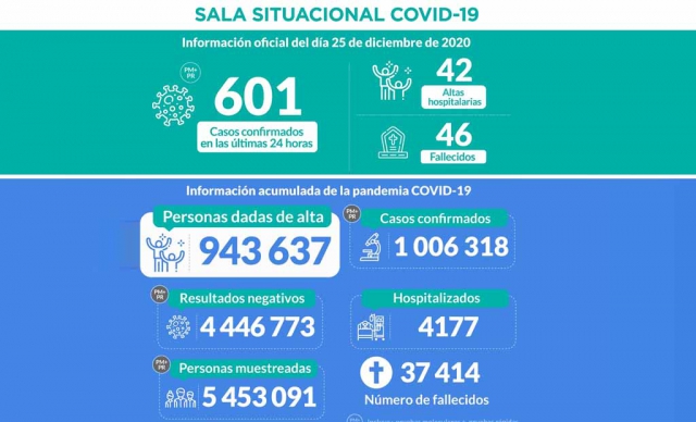 ERP. A 37 414 se elevó el número de fallecidos a causa del coronavirus covid-19 en Perú; mientras que los casos positivos totalizan 1 006 318; informó el Ministerio de Salud (Minsa). Hasta las 22:00 horas del día 25 de diciembre de 2020 se han procesado muestras para 5 453 091 personas por la COVID-19, obteniéndose, 1 006 318 casos confirmados y 4 446 773 negativos.