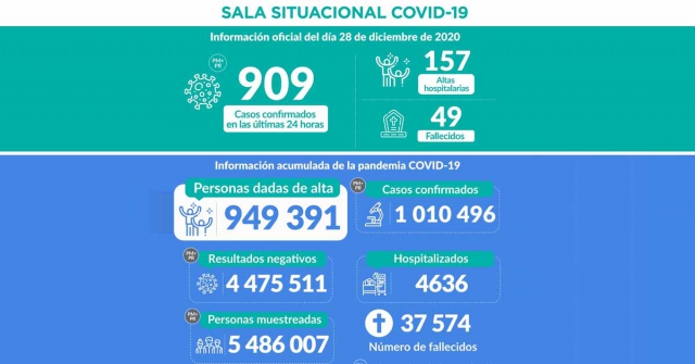 ERP. A 37 574 se elevó el número de fallecidos a causa del coronavirus covid-19 en Perú; mientras que los casos positivos totalizan 1 010 496; informó el Ministerio de Salud (Minsa). Hasta las 22:00 horas del día 28 de diciembre de 2020 se han procesado muestras para 5 486 007 personas por la COVID-19, obteniéndose, 1 010 496 casos confirmados y 4 475 511 negativos.