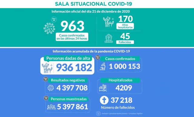 ERP. A 37 218 se elevó el número de fallecidos a causa del coronavirus covid-19 en Perú; mientras que los casos positivos totalizan 1 000 153; informó el Ministerio de Salud (Minsa). Hasta las 22:00 horas del día 21 de diciembre de 2020 se han procesado muestras para 5 397 861 personas por la COVID-19, obteniéndose, 1 000 153 casos confirmados y 4 397 708 negativos.