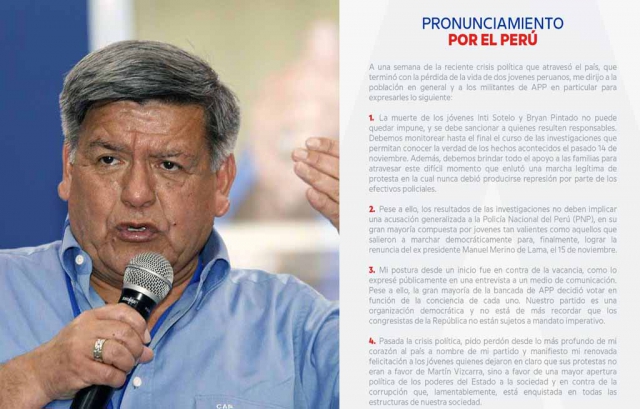 ERP. El líder de Alianza para el Progreso (APP), César Acuña, pidió hoy perdón al país tras la crisis política producida tras la aprobación de la vacancia presidencial del expresidente Martín Vizcarra por parte de esta bancada y adelantó que se otorgará el voto de confianza al Gabinete Ministerial encabezado por Violeta Bermúdez.