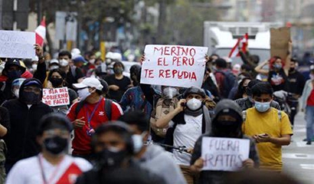 ERP. Una vez más miles de peruanos salieron a las calles a protestar contra el gobierno de facto dirigido por Manuel Merino de Lama. Tal como sucedió en el día previo, diversos puntos de las ciudades más importantes del país, fueron copadas por estudiantes, jóvenes, y adultos quienes piden la renuncia inmediata del congresista tumbesino y cuestionan la actitud del Congreso de la República.