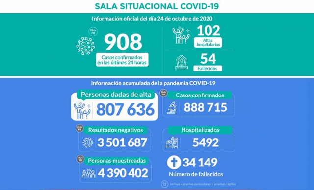 ERP. A 34,149 se elevó el número de fallecidos a causa del coronavirus covid-19 en Perú; mientras que los casos positivos totalizan 888,715; informó el Ministerio de Salud (Minsa). Hasta las 22:00 horas del día 24 de octubre de 2020 se han procesado muestras para 4 390 402 personas por la COVID-19, obteniéndose, 888 715 casos confirmados y 3 501 687 negativos.