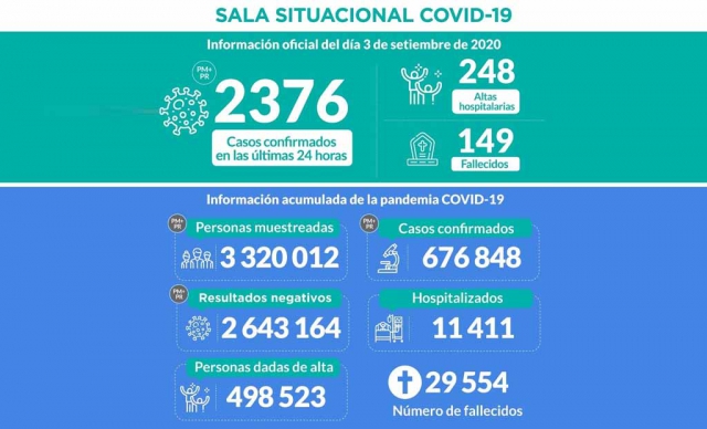 ERP. A 29,554 se elevó el número de fallecidos a causa del coronavirus covid-19 en Perú; mientras que los casos positivos totalizan 676,848; informó el Ministerio de Salud (Minsa). Hasta las 00:00 horas del día 4 de septiembre de 2020 se han procesado muestras para 3 320 012 personas por la COVID-19, obteniéndose, 676 848 casos confirmados y 2 643 164 negativos.