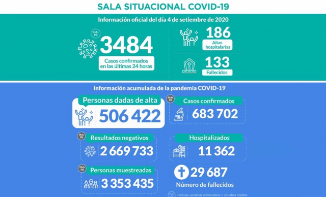 ERP. A 29,687 se elevó el número de fallecidos a causa del coronavirus covid-19 en Perú; mientras que los casos positivos totalizan 683,702; informó el Ministerio de Salud (Minsa). Hasta las 00:00 horas del día 5 de septiembre de 2020 se han procesado muestras para 3 353 435 personas por la COVID-19, obteniéndose, 683 702 casos confirmados y 2 669 733 negativos.