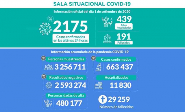 ERP. A 29,259 se elevó el número de fallecidos a causa del coronavirus covid-19 en Perú; mientras que los casos positivos totalizan 663,437; informó el Ministerio de Salud (Minsa). Hasta las 00:00 horas del día 2 de septiembre de 2020 se han procesado muestras para 3 256 711 personas por la COVID-19, obteniéndose, 663 437 casos confirmados y 2 593 274 negativos.