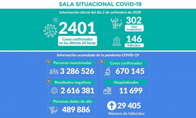 ERP. A 29,405 se elevó el número de fallecidos a causa del coronavirus covid-19 en Perú; mientras que los casos positivos totalizan 670,145; informó el Ministerio de Salud (Minsa). Hasta las 00:00 horas del día 3 de septiembre de 2020 se han procesado muestras para 3 286 526 personas por la COVID-19, obteniéndose, 670 145 casos confirmados y 2 616 381 negativos.