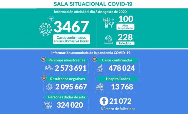 ERP. A 21,072 se elevó el número de fallecidos a causa del coronavirus covid-19 en Perú; mientras que los casos positivos totalizan 478,024; informó el Ministerio de Salud (Minsa). Hasta las 00:00 horas del día 9 de agosto de 2020 se han procesado muestras para 2 573 691 personas por la COVID-19, obteniéndose, 478 024 resultados positivos y 2 095 667 negativos.