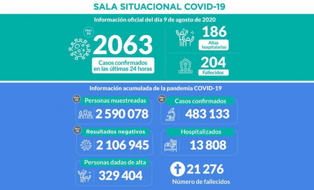 ERP. A 21,276 se elevó el número de fallecidos a causa del coronavirus covid-19 en Perú; mientras que los casos positivos totalizan 483,133; informó el Ministerio de Salud (Minsa). Hasta las 00:00 horas del día 10 de agosto de 2020 se han procesado muestras para 2 590 078 personas por la COVID-19, obteniéndose, 483 133 casos confirmados y 2 106 945 negativos.
